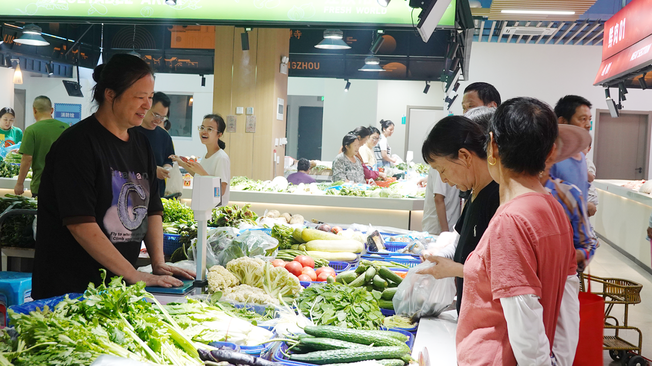 在江欣市集内,每个摊位前都配备了智能溯源电子秤,称重过程中即时显示菜品价格与来源,让消费者对菜品的各项信息一目了然;市场内的大数据展示屏实时滚动商户信用、菜价波动、客流数据等信息,全力打造看得见的“安心菜场”。