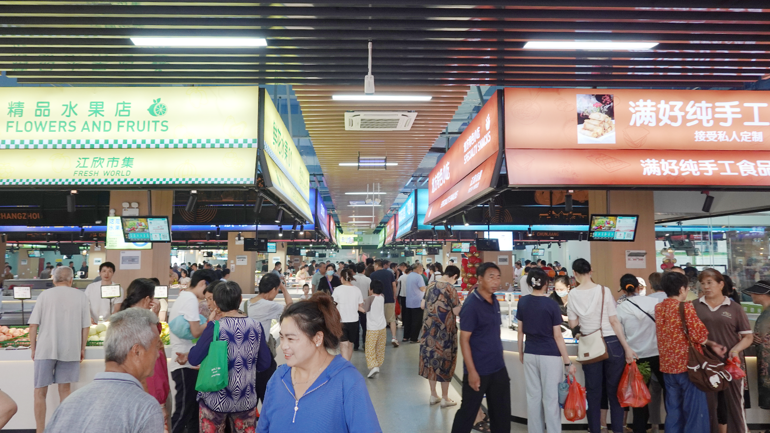 江欣市集位于春江街道天平山路,总面积为2000余平方米。该智慧农贸市场内全域覆盖中央空调,温度适宜,彻底告别以往的闷热嘈杂。整体采用干湿分离的科学化分区,活禽区独立外置、水产区地面清爽无积水、蔬菜区明亮整洁无异味,让消费者享受到舒适的购物环境。